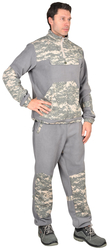 Куртка прямого силуэта; удлиненная; с центральной застежкой в верхней части куртки; с воротником - «стойка»; с кокеткой переда; с внутренним нагрудным карманом по центру полочки с клапаном, с одним нижним накладным фигурным карманом с вертикальным делением по центру на два кармана. Рукава цельнокроеные с фигурными настрочными налокотниками; по низу рукава от рукавно-бокового шва по передней части рукава до налокотника стяжка на ткацкую резинку, По низу куртки притачной пояс со сгибом, с разрезами по боковым швам и вставленной шляпной резинкой с фиксаторами по бокам. Брюки прямого покроя; с притачным поясом, с прорезными боковыми карманами с притачными манжетами (из отделочной ткани) по низу брюк со стяжкой на резинку ткацкую и проложенной посередине отделочной строчкой. Брюки со съемным поясом из помочной резинки с закрепленной на концах застежкой-фастекс.Ткань верха: «Флис» состав: 100% п/э, пл. 280 г/м2. Цвет: серый. Ткань отделочная: : «Рип-Стоп», состав: 80% п/э 20% х/б. Детали отделки: кокетки полочек и спинки, внешний воротник, клапан нагрудного кармана куртки, нижний накладной карман, налокотники, притачной пояс куртки, наколенники брюк, манжеты куртки, манжеты брюк, «листочки» прорезных карманов брюк, кулиски для стяжки низа рукавов, кулиски для стяжки низа задних половинок брюк, лея брюк на задних половинках, пояс брюк, шлевки брюк. ГОСТ 25295-2003