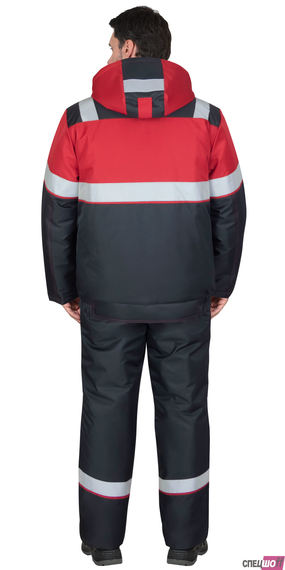 Костюм зимний, утеплённый, состоит из укороченной куртки и полукомбинезона. В костюме предусмотрена лента светоотражающая мелкодисперсная белая ш.50 мм для обеспечения видимости.