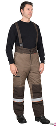 Брюки прямые, с притачной утеплённой подкладкой, центральной застежкой гульфика на молнию, широким фигурным поясом, с застежкой на пуговицы, с узкими шлевками на задних половинках и шлёвками-держателями фастексов на передних половинках, внутренними боковыми карманами с наклонным входом, накладным карманом на правом боковом шве, с застежкой на молнию, накладными задними карманами, наколенниками на передних половинках, со съемными бретелями.