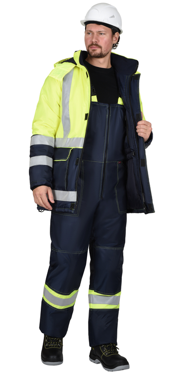 Куртка прямого силуэта; с притачной утепл.нной подкладкой, с центральной заст.жкой на двухзамковую т.сьму - «молнию» и ветрозащитным клапаном застегивающийся на липучку, воротником – стойка, верхним и нижними накладными карманами с клапанами на текстильную застежку - «липучку». С кулисой по линии талии, с внутренним карманом на «молнии». По кокеткам полочек, спинке в области талии и рукавов настрачивается СОП ш.50мм для обозначения сигнальной видимости.Полукомбинезон прямой, с центральной заст.жкой на двухзамковую тесьму - «молния», с накладными боковыми карманами, с наколенниками, с эластичной лентой по спинке, для лучшего прилегания. Бретели регулируются при помощи эластичной ленты и пряжек фастексов.По низу полукомбинезона настрачивается СОП ш.50мм для обозначения сигнальной видимости.