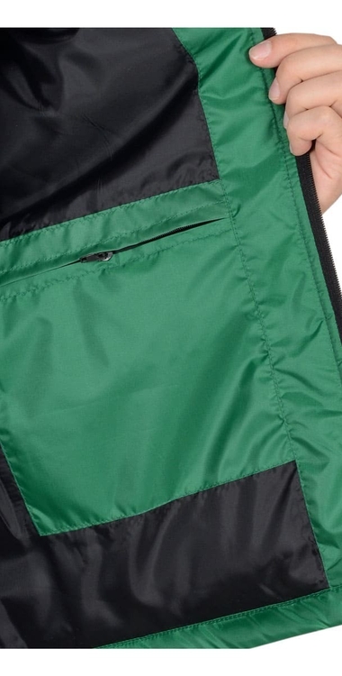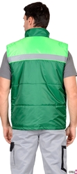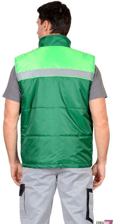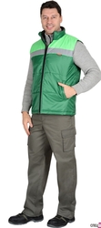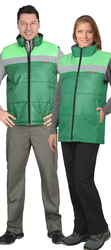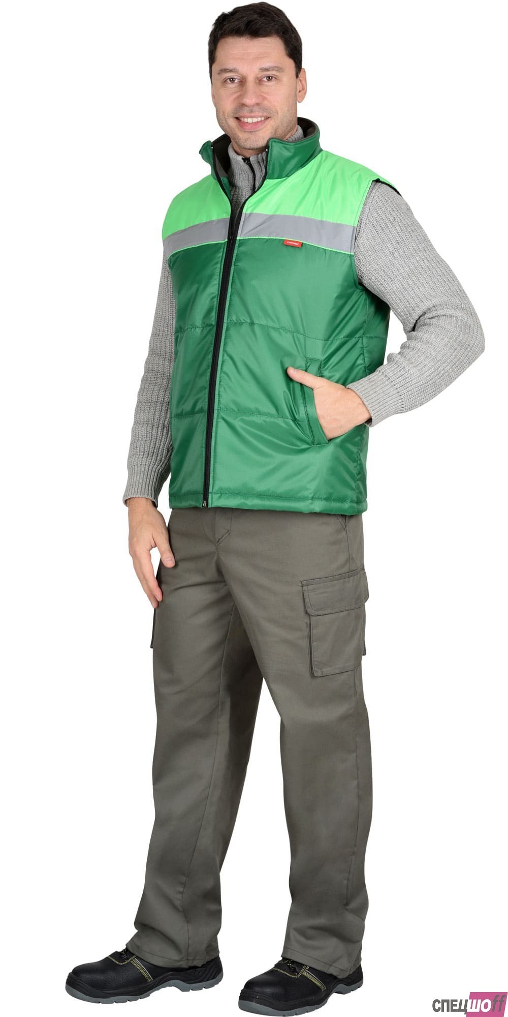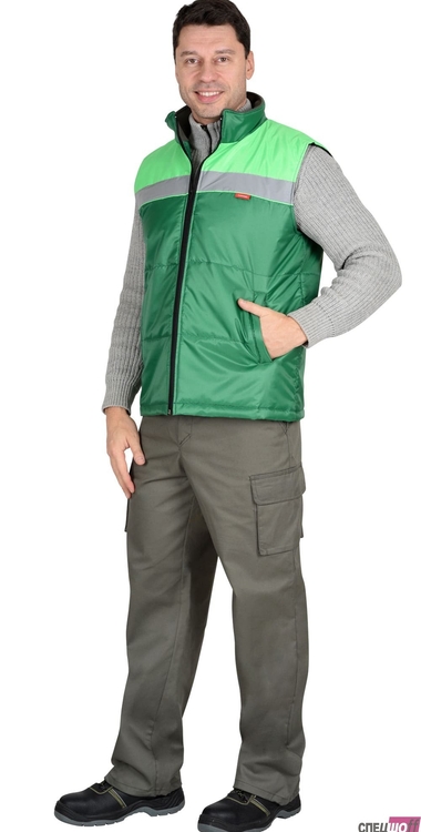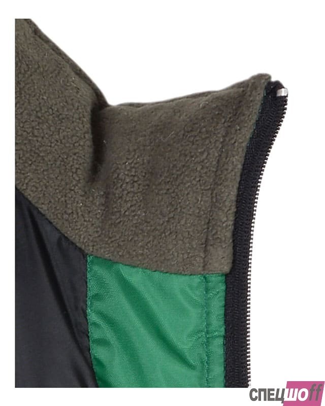 Жилет прямого силуэта, утеплённый, с притачной подкладкой, с центральной застёжкой на тесьму - "молния", с воротником стойка, с прорезными карманами с "листочкой", с наклонным входом. Ткань верха: "Оксфорд", состав: 100% п/э, пл. 105 гр/м2 Ткань подкладочная: "Таффета", 100 % - п/э; на внутренней части воротника - "Флис" - 100% п/э, пл. 180 г/м2. Утеплитель: Синтепон, пл. 150 г/м2 - 1 слой.